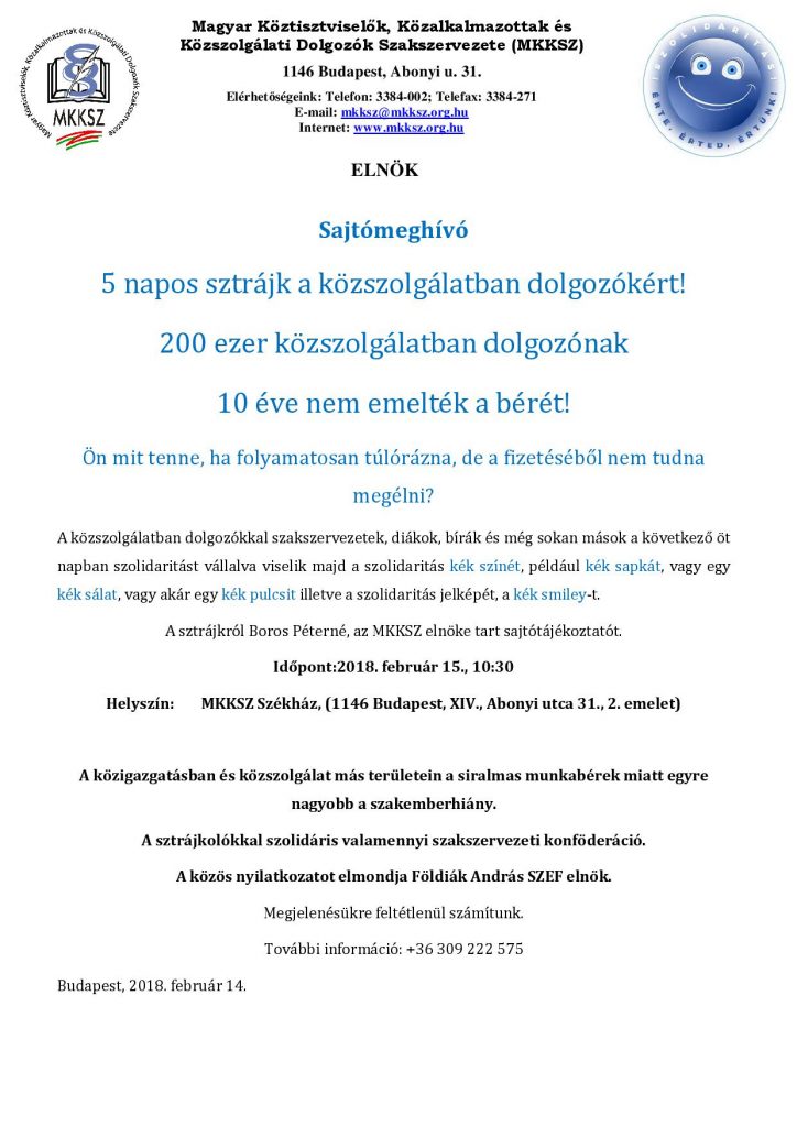 A közigazgatásban és közszolgálat más területein a siralmas munkabérek miatt egyre nagyobb a szakemberhiány.A sztrájkolókkal szolidáris valamennyi szakszervezeti konföderáció.A sztrájkról Boros Péterné, az MKKSZ elnöke tart sajtótájékoztatót.Időpont:2018. február 15., 10:30Helyszín: […]