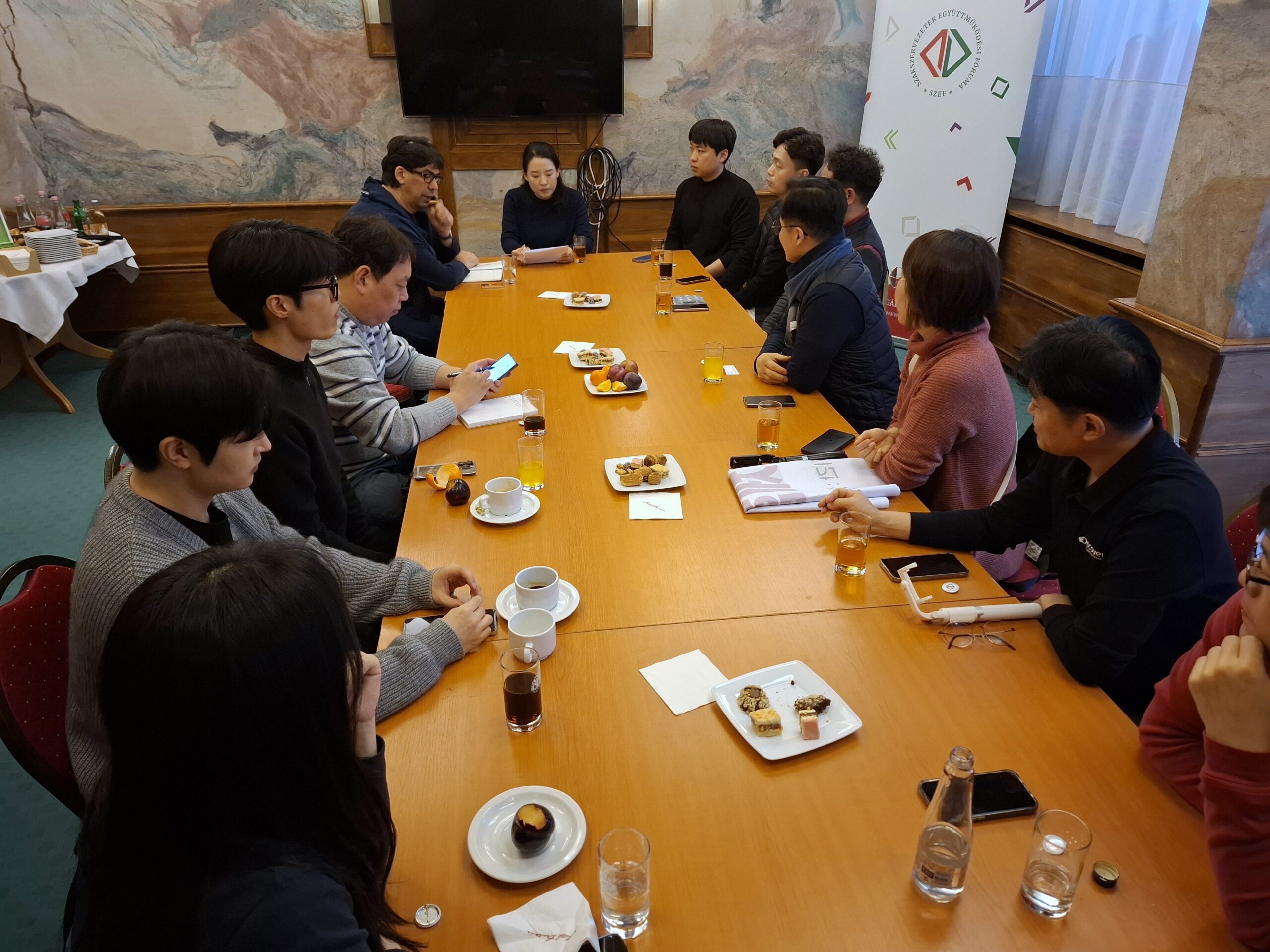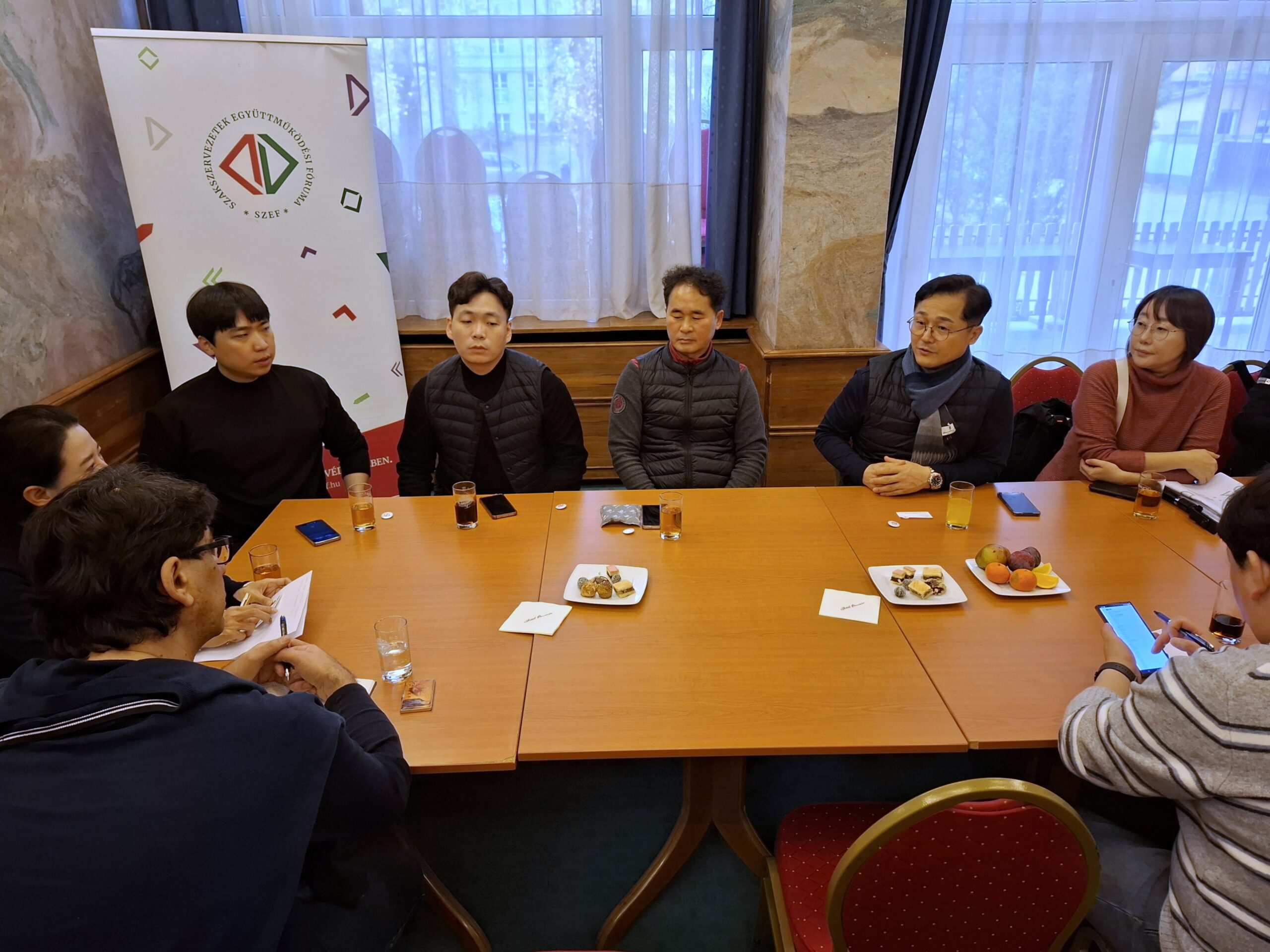A másfél órás megbeszélésre a közép-európai tanulmányúton lévő partnerek kérésére került sor. Az egyeztetés során érdeklődtek a tripartit érdekegyeztetés magyarországi rendszeréről, a SZEF, mint közszférás szakszervezeti szövetség érdekérvényesítési és közpolitikai lehetőségeiről, a szakszervezeteket érintő magyarországi politikai repressziókról és a közszféra munkavállalóit érintő egyéni politikai nyomásgyakorlásról. A beszélgetés során szóba kerültek a magyar közszférás szakszervezeteket sújtó és ILO egyezményeket sértő intézkedések is. Kérdésre válaszolva a SZEF szervezési titkára bemutatta a közösségépítés, a demokrácia fejlesztés és az aktivista képzés konföderációs tevékenységét is.