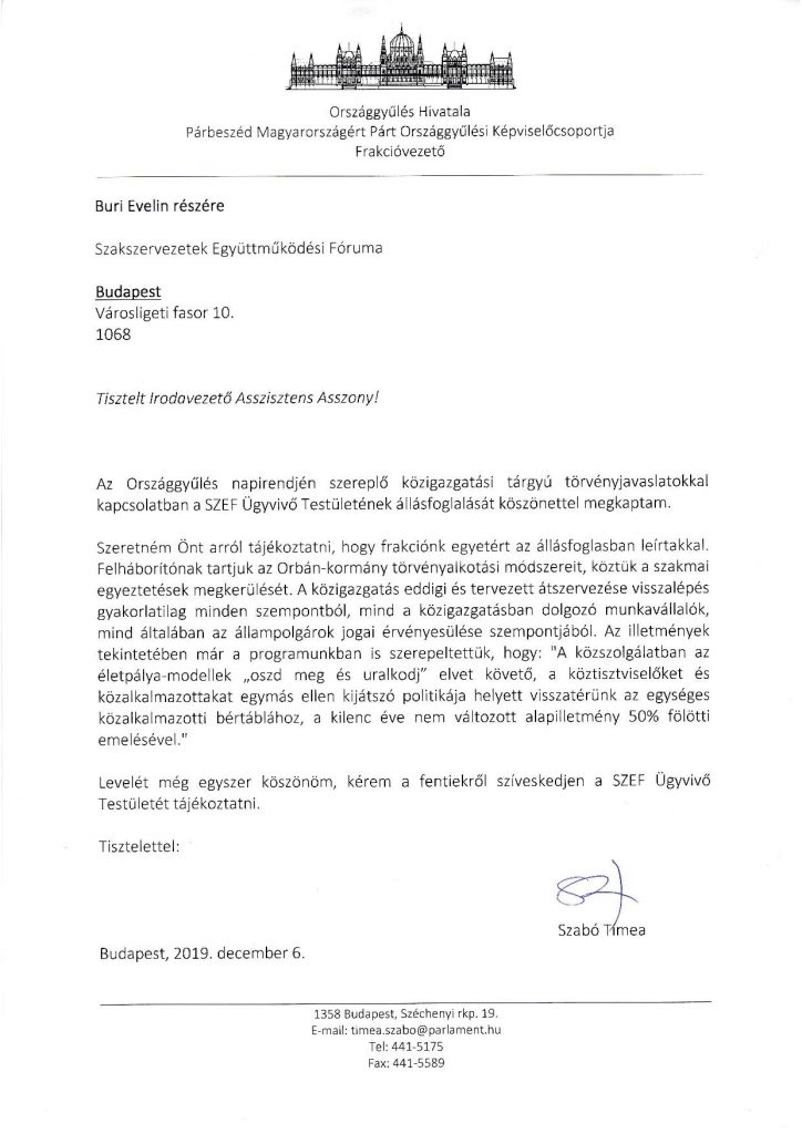 A Párbeszéd Magyarországért támogatásról biztosította a Szakszervezetek Együttműködési Fórumának Ügyvivő Testületét a Közigazgatási tárgyú törvényjavaslatokkal kapcsolatban tett állásfoglalásában. Erre levélben reagált Szabó Tímea Frakcióvezető Asszony, melyet itt olvashatnak: